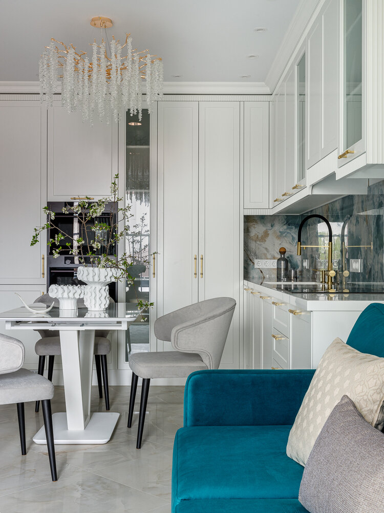 Кухонный гарнитур — угловой с необходимой встроенной техникой.
